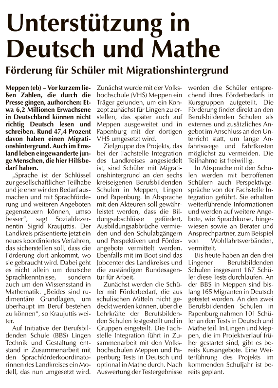 Die Kursleitenden der vhs Meppen führen seit dem 20.05.19 täglich nachmittags Sprachförderunterricht in den Räumlichkeiten der BBS in Meppen und Lingen durch. Zuvor fanden 15 Einstufungstermine mit 340 Personen statt. Die Teilnehmenden sind in 15 Kursen nach den GER-Niveaustufen zugeteilt. Am 19.06.19 erläuterten alle Beteiligten in einer gemeinsamen Pressekonferenz die konzertierte Aktion.